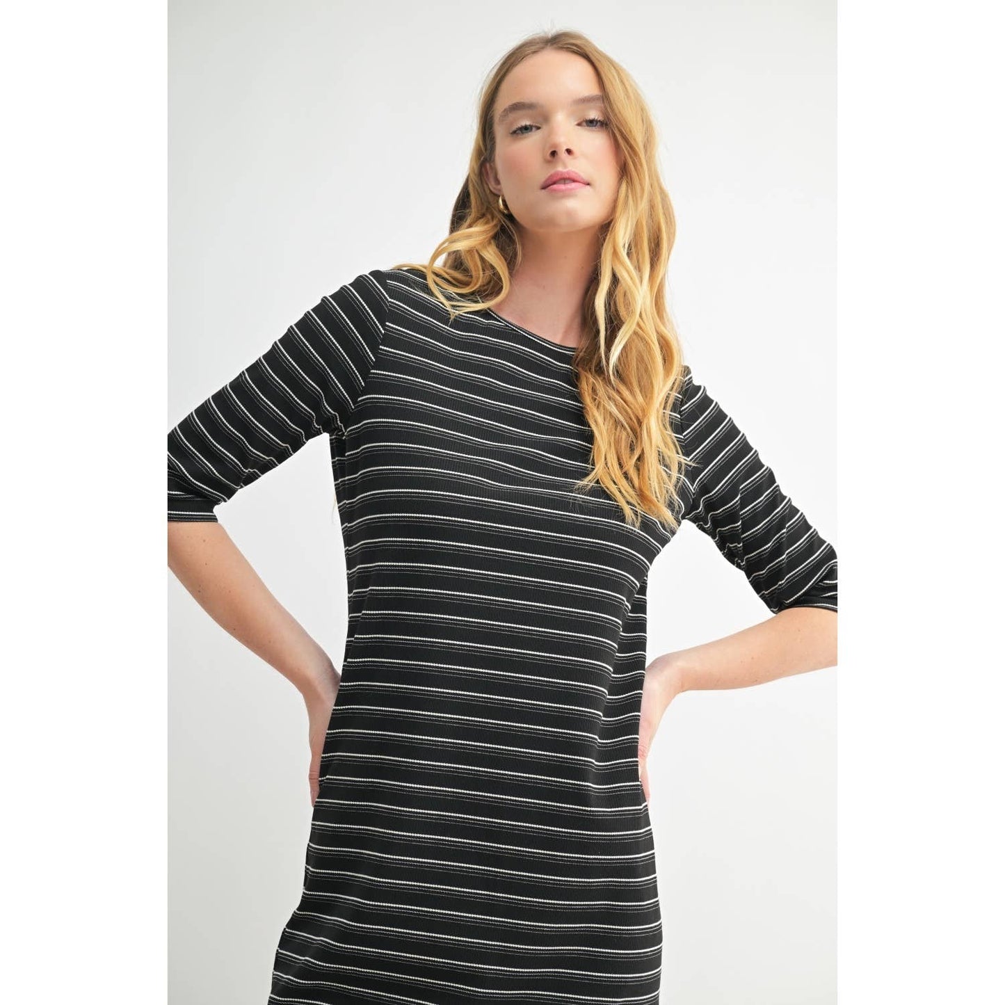 The Stripe Elbow Sleeve Knit Dress is a staple piece for your wardrobe. Designed in LA, this dress embodies timeless styles. It combines the latest trends with the highest quality, making it suitable for everyday wear. Stay stylish and comfortable with this knit dress.