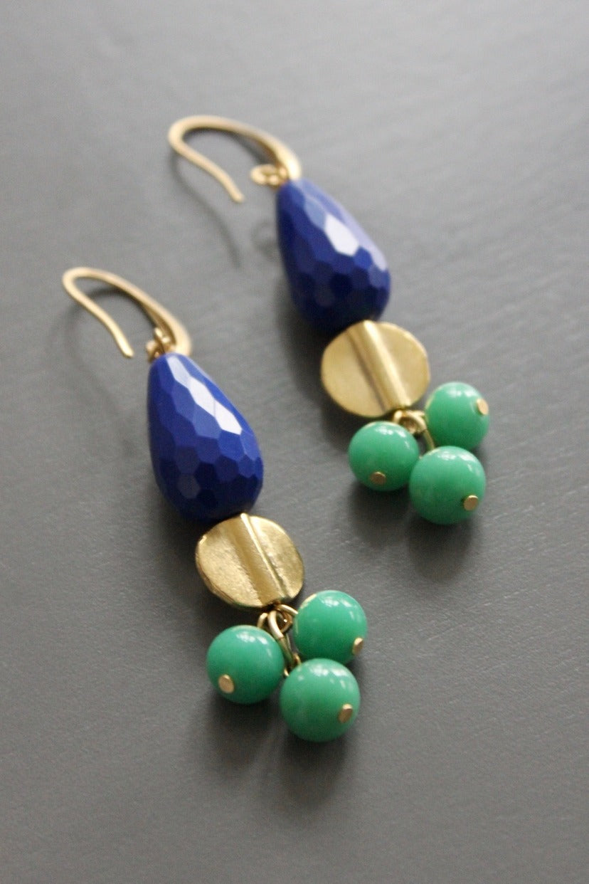 18k gold plated brass hook earrings with glass and brass. Each pair weighs .53 oz. and measures 2.75 inches long.